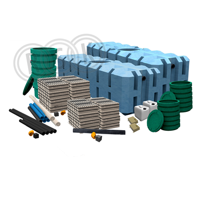 IN-DRÄN Markbädd för WC+BDT-vatten, 10 personer, 2 hushåll. Hög skyddsnivå. Innehåller: 1 x slamavskiljarpaket SA 6012ce 2 x ekotreat wifi, fällningsenhet 2 x infiltrationspaket IN-DRÄN I8 1 x tilläggspaket markbädd 1 x paket kombibrunn Fälningsmedel säljs separat.
