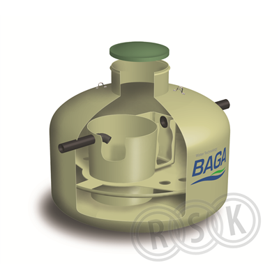 Slamavskiljare avsedd för 1 hushåll i glasfiber. Ø 2000 x 1850 våtvolym: 3 m3. Med integrerad pumpbrunn.