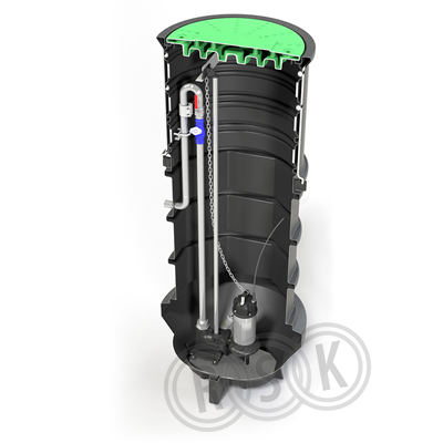 Komplett pumpstation PS900-1 inkl 3-fas skärande avloppspump GD20A. Utlopp invändig gänga 32, CC 1200 mm Inlopp Ø 110 mm, CC 910 mm alt. 1215 mm (levereras oborrad)