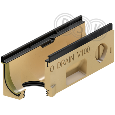 Ränna utan fall. Typ 20.2 med bottenutlopp DN100. Integrerad gummitätning. Tillverkad i polymerbetong med förstärkt sargkant i segjärn. Integrerad bullerdämpning. Belastningsklass upp till F900.