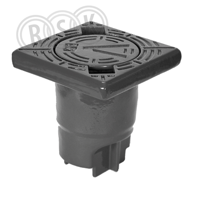 Fyrkantig betäckning av segjärn med runt lock med inskription "V" och AVK logga. För AVK garnityr - målad med svart epoxy.