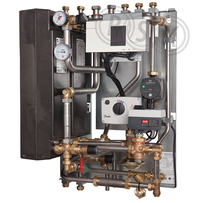 Fjärrvärmecentral för flerfamiljshus upp till ca. 20 lägenheter i fjärrvärmesystem, Prefarbicerad värmeväxlare för primärsystem. enheten är uppdelad på två kretsar, en för värme och en för varmvatten. växlarna som sitter på enheten är dimplade växlare typ Micro Plate för att säkerställa låga tryckförluster och returtemperaturer. enheten är avsedd för väggmontage