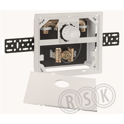Infälld box med golvvärmereglering och extra tilloppsledning samt justerbar förkromad täckplatta och termostat F för individuell rumstemperaturreglering utan elektrisk anslutning, röranslutning G3/4