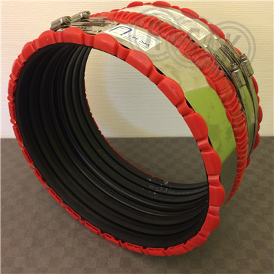 Kojapo Funke VPC Rörkoppling / Övergångskoppling. Arb.omr.450-520mm. Längd 210mm. Utförande: Montagebur av slagtålig polykarbonatplast. Gummi: EPDM. Rostfria band. Koppling för rör av olika dimensioner.