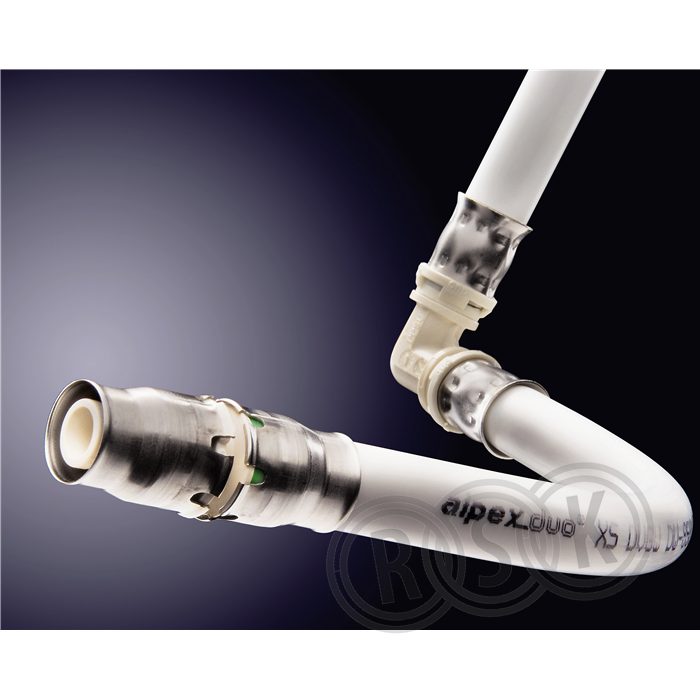 Fränkische Alpex-Plus rak koppling. Krävs ingen pressmaskin då rören endast sticks in och det blir tätt. Krävs särskilt verktyg för kalibrering av rörändar innan instick, samt om rören behöver tas ut igen. Material PPSU.