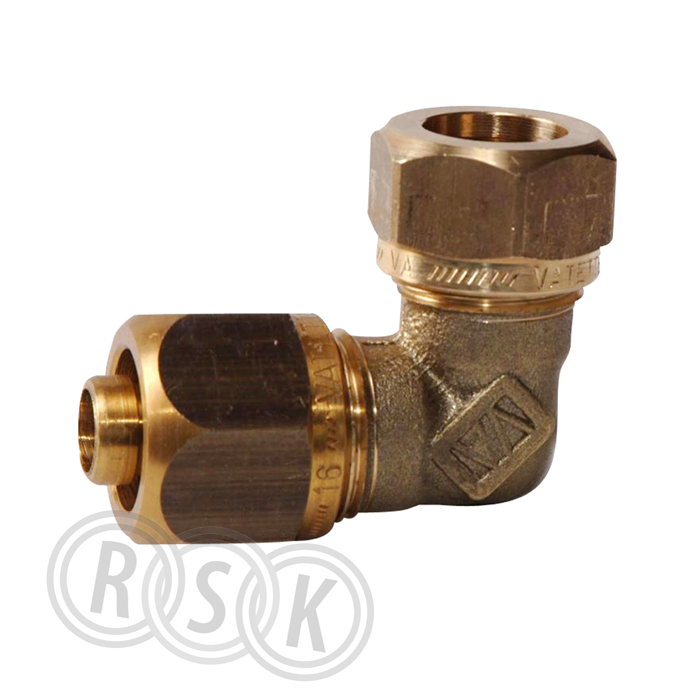 Övergångskoppling vinkel VA2139. För övergångar från PEX, Alu-PEX, PEM eller PB-rör till Kopparrör.