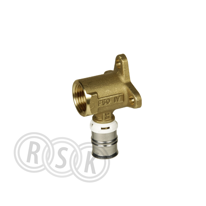 Vinkelkoppling med skruvhål för infästning i vägg med invändig gänga för anslutning av t ex tappventil. Presskoppling till alupexrör för tappvatten och värmeinstallationer, med läckageindikering av PPSU och varmpressad mässing CW617, presskappa av rostfritt stål, o-ring av EPDM, arbetstemperatur 110°c vid 10 bar