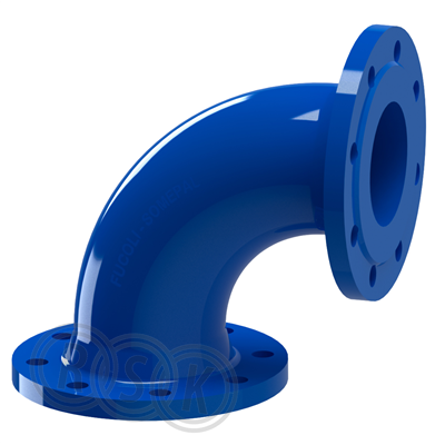Flänsad 90° böj med roterbara flänsar. Böjen är tillverkad i segjärn (EN-GJS-500-7) DIN EN 1563. Korrosionsskydd DIN 30677-2, enligt GSK (RAL GZ662) Flänsar enligt EN 1092-2