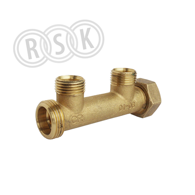 Alpex fördelare med två avstick. En utvändig och en invändig gänga med utvändig gänga på avsticken. PN10. Material avzinkningshärdig mässing.