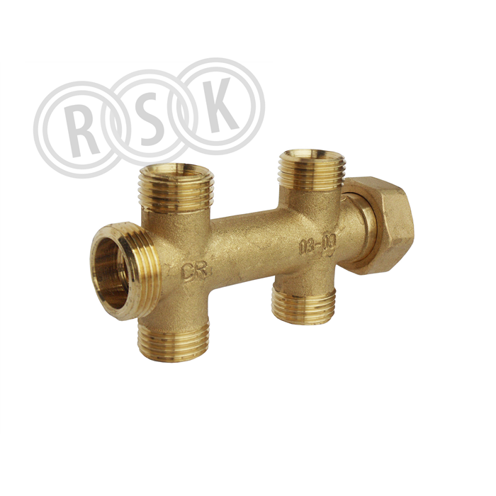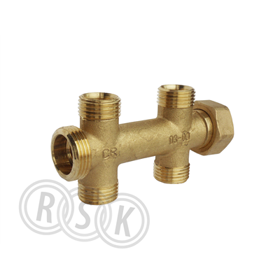 Alpex fördelare med två avstick upp och två avstick ner. En utvändig och en invändig gänga med utvändig gänga på avsticken. PN10. Material avzinkningshärdig mässing.