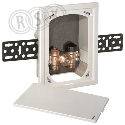 Infälld box med golvvärmereglering och justerbar vit täckplatta för individuell rumstemperaturreglering med termiskt eller motordrivet ställdon alternativt termostat F, röranslutning G3/4