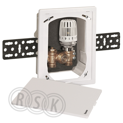 Infälld box med golvvärmereglering och justerbar vit täckplatta för individuell returtemperaturbegränsning, röranslutning G3/4