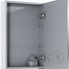 ARIELLA BAS SPEGELSKÅP har enkelspegel på utsidan av den mjukstängande dörren samt eluttag IP44. Insidan av spegeldörren är av spånskiva. Spegelskåpet används med fördel tillsammans med Ariella Bas Belysningsramp.