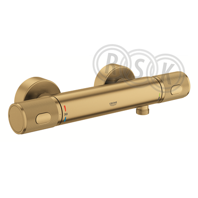 Precision Feel, 150 CC Termostatblandare för dusch, DN 15, Borstad Cool Sunrise, Väggmontage GROHE CoolTouch - ingen risk för brännskador GROHE LongLife-yta GROHE TurboStat kompakt insats med vaxbaserad keramisk kropp GROHE ProGrip med räfflad struktur GROHE SafeStop vid 38° C GROHE SafeStop Plus valfri extra temperaturbegränsare vid 43°C inkluderad Grepp med GROHE EcoButton GROHE EcoJoy vattenbesparande teknologi Inbyggd blandningsspärr Keramiskt överstycke 1/2", 180° Duschanslutning 1/2" nedåt Inbyggd backventil Inloppssil S-anslutningar Täckbricka i metall Backventil mot tillbakaflöde