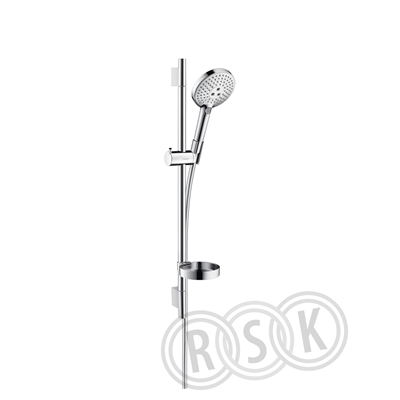 • består av: handdusch, duschstång, duschslang, glidfäste, tvålkopp • duschhuvud storlek: 125 mm • stråltyp: Rain, RainAir, Whirl • bekväm stråltypsomställning via Select-knapp • 90° justerbar handduschhållare, svänger till vänster och höger, upp och ner • maximal flödesmängd vid 3 bar: 15 l/min • väggfästen av plast • stångens form: rund • rörlängd: 718 mm • duschstång diamter: 22 mm • borravstånd: 625 mm • kulled förhindrar att slangen vrider sig
