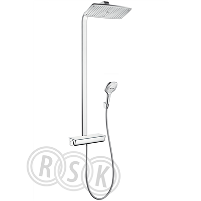 Hansgrohe Raindance Select 360 Showerpipe Nordic, Krom/Vit •huvuddusch Raindance E 360 Air •duschhuvudsstorlek: 360 x 190 mm •huvuddusch med inställningsbar vinkel •stråltyp: RainAir •flödesmängd RainAir (vid 3 bar): 17 l/minut •helförkromad strålskiva •duscharmslängd: 380 mm •termostat Ecostat Select •med generös hylla •yta hylla: krom eller vit •isolerade vattenslangar •säkerhetsspärr vid 40°C •inställningsbar varmvattenbegränsning •förbrukaraktivering genom vridning •monteringstyp: ytmontering •anslutningsstorlek DN15 •anslutningsgänga G ½ •stickmått 150 cc ± 12 mm •består av: kakelutjämningsskiva (grå) •Vid installation på befintlig G ½-anslutning, måste adapter med art.nr. 02026000 användas •Ljudklass: I •Flödesklass: B, O •WRAS 1403038