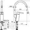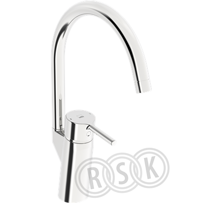 Köksblandare med pinnspak, hög svängbar C-utloppspip och strålsamlare. Utloppspipens svängradie är förinställd på 120° (kan begränsas till 0°/60°/360°). Inbyggd spärr för begränsning av temperatur och flöde via Oras 4.0 keramiska kassett. F = flexibel anslutning.