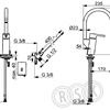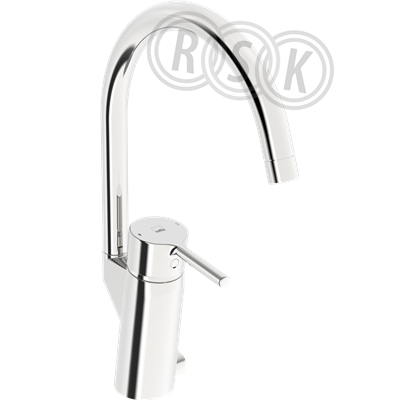 Köksblandare med elektronisk avstängningsventil 3V batteridrift, automatisk avstängning 4/12 tim. Ettgrepps funktion via pinnspak, hög svängbar C-utloppspip och strålsamlare. Utloppspipens svängradie är förinställd på 120° (kan begränsas till 0°/60°/360°). Inbyggd spärr för begränsning av temperatur och flöde via Oras 4.0 keramiska kassett. F = flexibel anslutning.