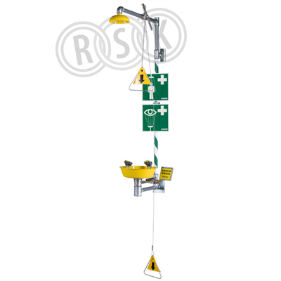 Kombinerad ögon- och nöddusch, med galvaniserade järnrör och grön/vit stripe. Duschsil av pulverlackad syrafast stål. Kulventil, ej återgående, manövrerad med dragstång, samt draghandtag för krypande person. Ögondusch 3864 med automatisk tryck- och flödesreglering i varje munstycke. Tilledning dimensioneras för minimum flöde 76 l/min vid 2,4 bar tryck.