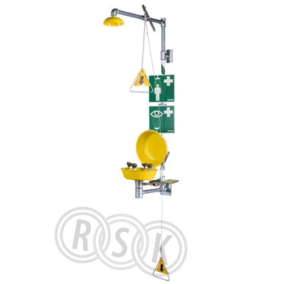 Kombinerad ögon- och nöddusch, med galvaniserade järnrör och grön/vit stripe. Duschsil av pulverlackad syrafast stål. Kulventil, ej återgående, manövrerad med dragstång, samt draghandtag för krypande person. Ögondusch 3866 med automatisk tryck- och flödesreglering i varje munstycke. Tilledning dimensioneras för minimum flöde 76 l/min vid 2,4 bar tryck.