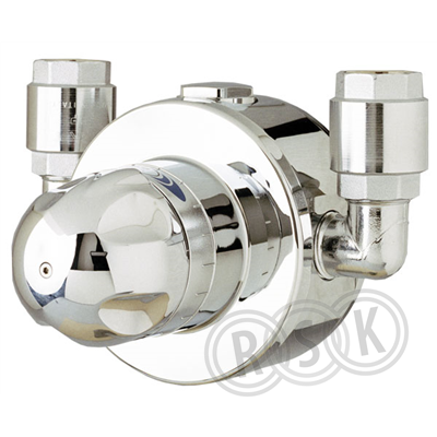 Krusman säkerhetsblandare 3843 är anpassad för nödduschar och kombiduschar. Säkerhetsblandaren levereras med kromade backventiler som monteras på arbetsplatsen. Den används och är anpassad för kroppsduschar och kombinationsduschar med ett flöde på ca 190 liter/minut. Tilledning dimensioneras för minimum flöde 190 l /min vid 3 bars tryck. Önskad utloppstemperatur ställs in med hjälp av temperaturhatten.