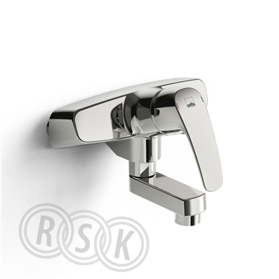 Väggmonterad grovköksblandare med fast utloppspip. Inbyggd spärr för begränsning av temperatur och flöde.