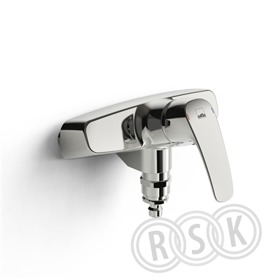 Väggmonterad grovköksblandare med snabbkoppling för ø13 mm slang och vakuumventil. Inbyggd spärr för begränsning av temperatur och flöde. Backventiler i inloppen, skyddamodul HD.