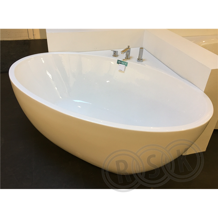 Hörnbadkar i sanitetsakryl, med badkarsblandare Nice. Utan bräddavlopp. 1270x1270x585mm. Avlopp/pop-up inkluderat. Baddjup 44cm. Badvattenvolym 200l inkl. badande.