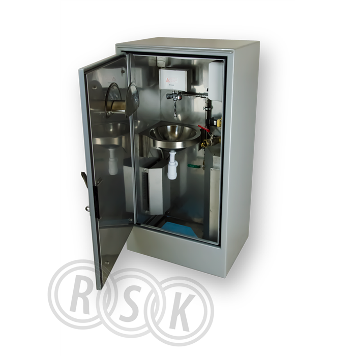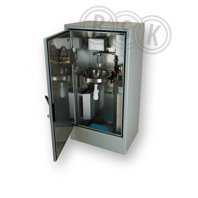 Teknikskåp i utförande enligt SS3492, "vandalsäkert", 4mm syrafast plåt. Isolerat med frostvakt 300W. Brutet vatten 60l/minit vid 5 Bar med slang och slanghållare. Hygiendel med genomströmningsvärmare. Innebelysning. Passar bra för avloppspumpsttaioner utan överbyggnad. I parker, stadsmiljö eller omården som ronderas mindre frekvent och mest sommarhalvåret.