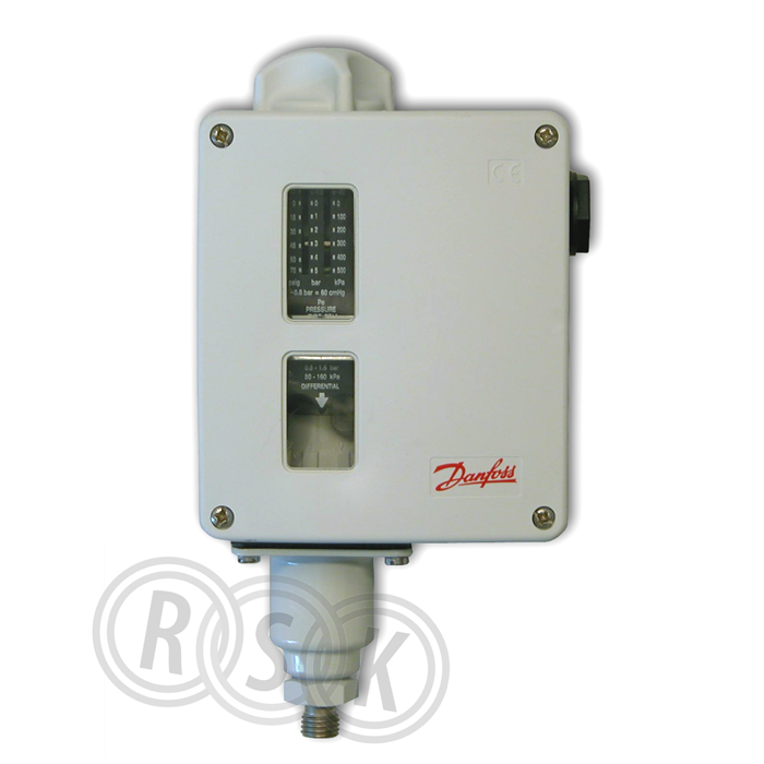 Pressostat RT 117, tryckområde 1000-3000 kPa, differens 100-400 kPa. Enpoligt växlande kontaktsystem, kapsling IP66, anslutning G3/8A.