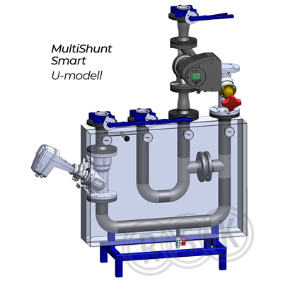 MultiShunt Smart är en serie shuntgrupper med en unik, prefabricerad konstruktion. Smart står för att de är standardiserade och färdigdimensionerade. Styrventilen är en tryckoberoende TA-modulator. Det gör att du inte behöver ta hänsyn till Kvs-värden, vilket förenklar dimensionering och injustering. MS Smart finns för både värme (V) och kyla (K). VU50 är en U-modell, vilket innebär att alla rör går rakt uppåt.