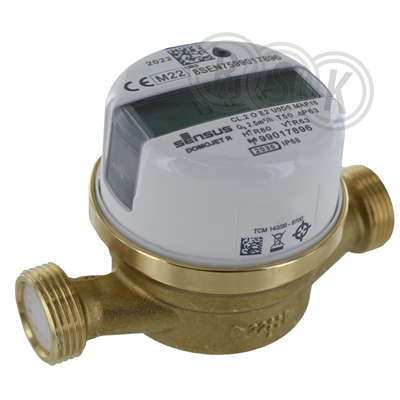 Sensus enkelstråliga vinghjulsmätare för varmvatten DomoJet R med inbyggd wM-Bus och digital display, DN15. Bygglängd 80mm. Anslutning G3/4" (G20) utvändig gänga, PN16. Dimensionerande flöde (Q3) =2,5 m3/tim. Ratio (R) =80. Vattentemperatur max 90 °C. Mätarhus i mässing. Inbyggd Sensus fjärravläsning med trådlös wM-Bus 868 MHz, enligt EN 13757 standard.