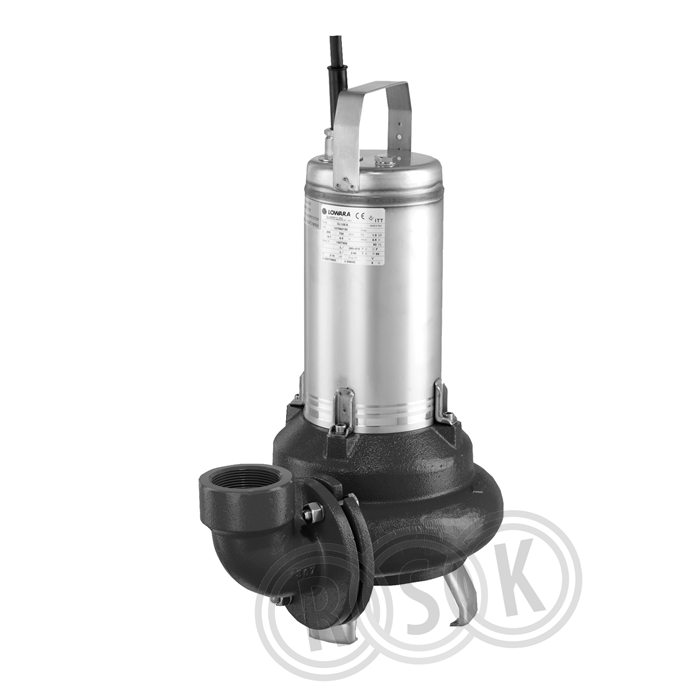 Flygt DLV 50-15. Trefas dränkbar centrifugalpump. Försedd med virvelhjul och främst avsedd att pumpa grund- dag- och avloppsvatten samt annan dränering. Materialspecifikation: Pumphus Gjutjärn, Axel AISI 304, Inre tätning Kol/keramik/NBR, Motorkåpa AISI 304, Pumphjul Gjutjärn, O-ringar NBR, Anslutning: Invändig gänga G2" 50 mm. Stämpeldata: 3/400 V/50 Hz, 3,93 A, 1,5 kW , 2850 RPM. Försedd med 10 m kabel typ H07RN-F Vätsketemperatur max 50/25 °C. för helt/delvis dränkt pump. Vikt 27 Kg.