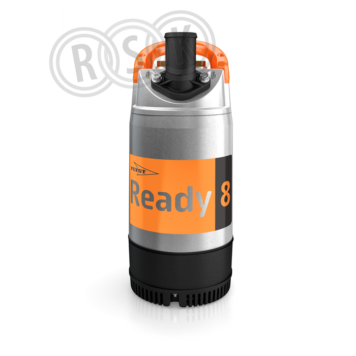 Flygt Ready 8, transportabel länspump BS 2008.212 MT-200. 50 mm utlopp för slang alternativt ISO G2 utv. gänga. Försedd med öppet flerkanalshjul. 1-fas motor, 230 V. 50 Hz 0,75 kW 4,20 A. Motorsladd: 10 m. H07RN-F 3x1. Stickkontakt monterad på kabeln.