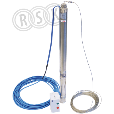 Dränksäker pump avsedd att användas för uppfordring och distribution av vatten från borrad brunn. Integrerad backventil. Levereras komplett med 15 m kabel och vajer.